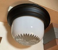 商品番号bs4336 新入荷! 乳白ガラスドーム電笠付きアールデコ文様天井直付けグローブ照明 サイズ 木枠直径34.5㎝ (笠直径24cm)