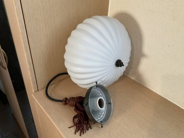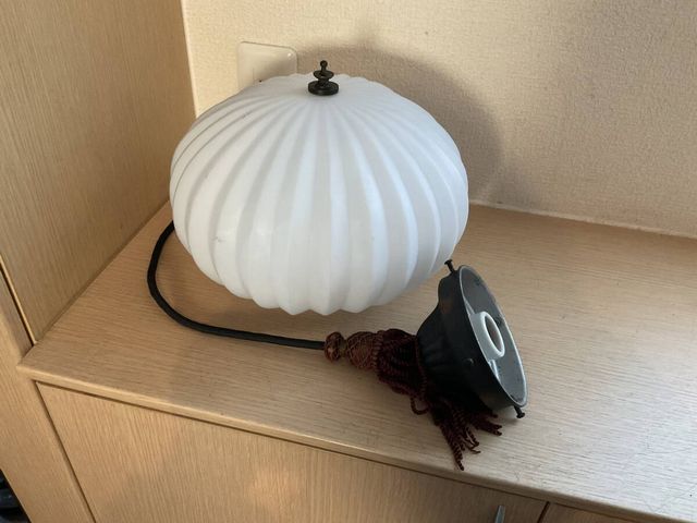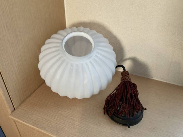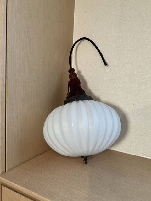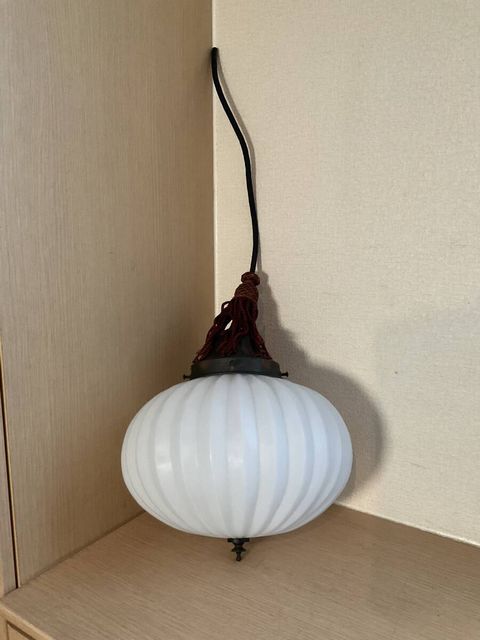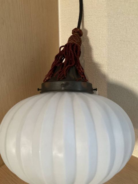 上手 菊形ホルダー付き乳白ガラスぼんぼり照明 房付き サイズ 約 全体縦67cm ホルダー口径10.5cm 笠直径25×口径9.6cm 経年による傷や汚れ、錆などがあります。 電笠に気になるワレカケは有りません。 配線は新しいものに交換済みです。 電球は口金E26をお使いください。 電球は付属しません。LEDでもお使い頂けます。 状態は、写真にてご判断頂ければ幸いです。 なにぶん古いモノですので御理解よろしくお願い致します。