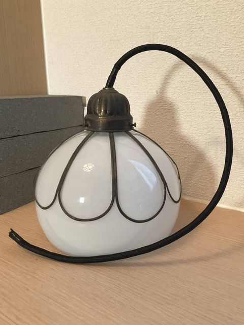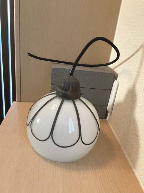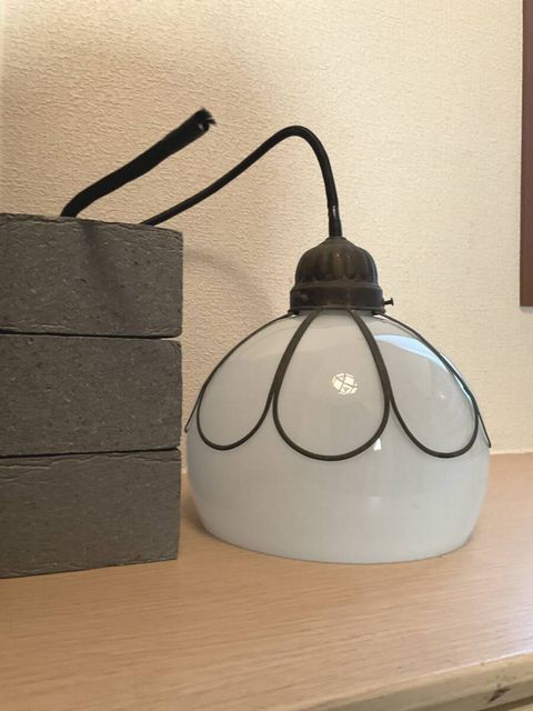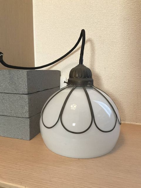 菊模様装飾巻き乳白ガラス電笠付きペンダント照明 サイズ 約 コード含む全体の長さ 78cm 電笠 縦14.5×横20×cm ガラスに気になるワレカケは、ありません。 経年による傷や汚れなどがあります。 配線は新しいものに交換済みです。 電球は口金E26をお使いください。 電球は付属しません。LEDでもお使い頂けます。 状態は、写真にてご判断頂ければ幸いです。 なにぶん古いモノですので御理解よろしくお願い致します。