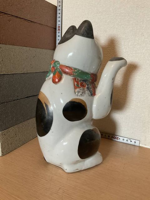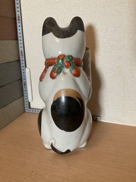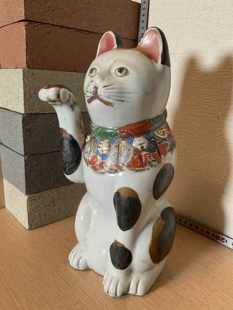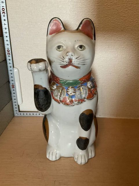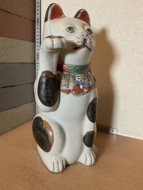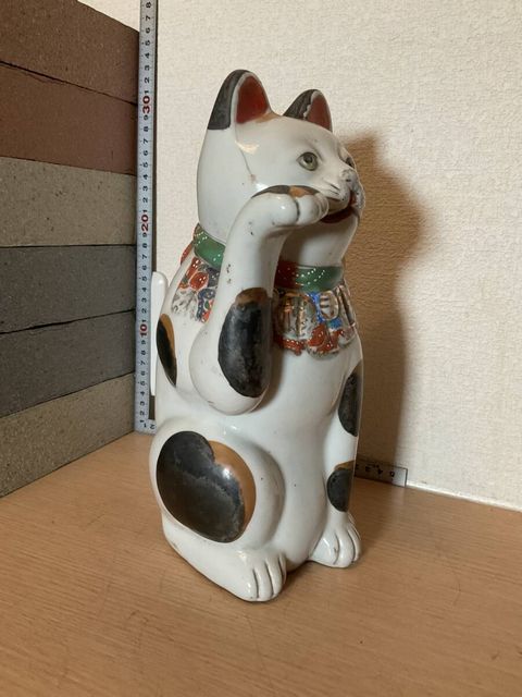 右手上げ 磁器の招き猫 ヒビ有り 戦前 色絵